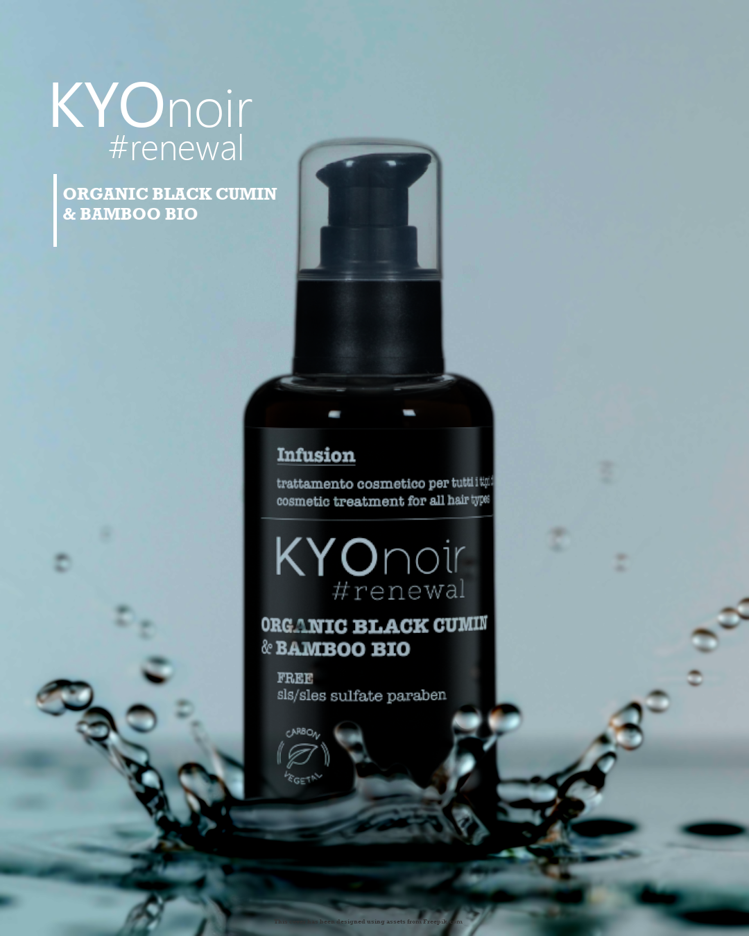 KYO NOIR infusion, grazie alla sua formulazione specifica con estratto di bambù e cumino nero, dona lucentezza e morbidezza ai capelli senza appesantire. Nutre, Idrata, districa, protegge e previene il crespo.